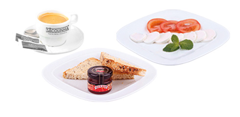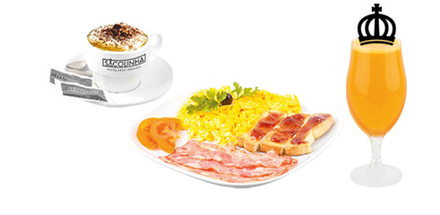 Capuccino + Sumo de Laranja + Ovos Mexidos com Bacon e Tomate + Torrada com Geleia ou Manteiga